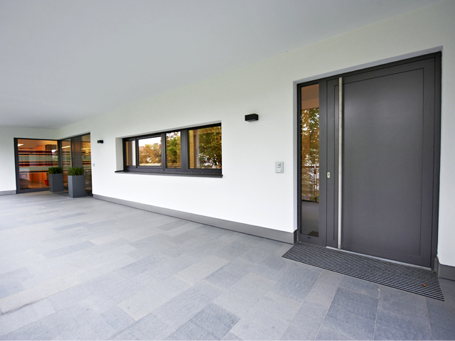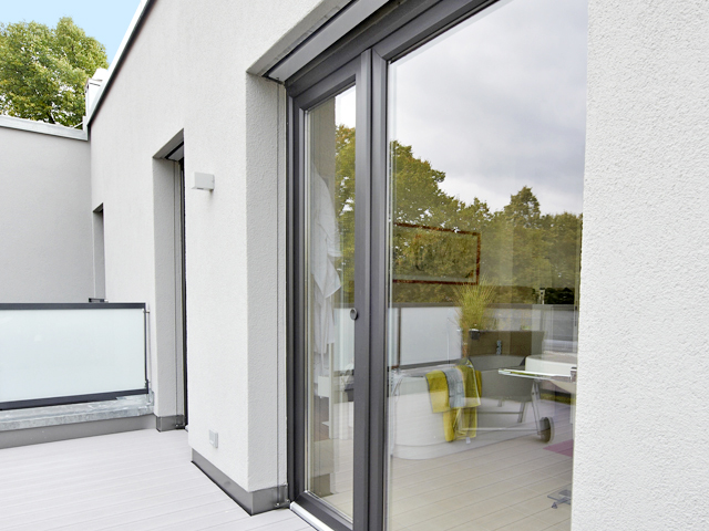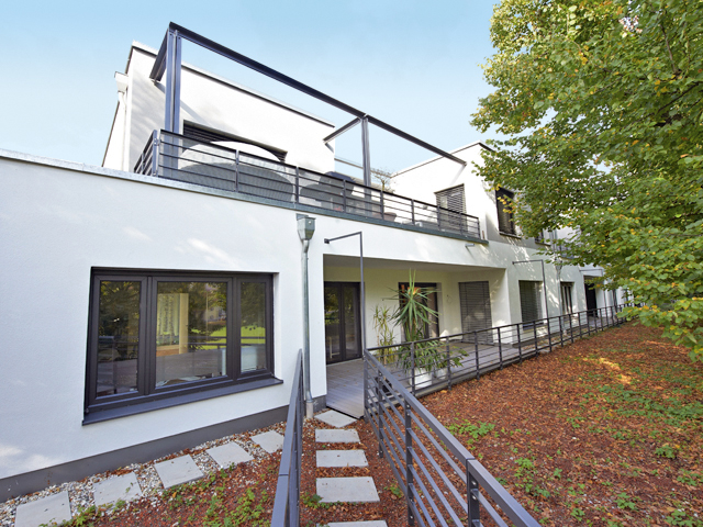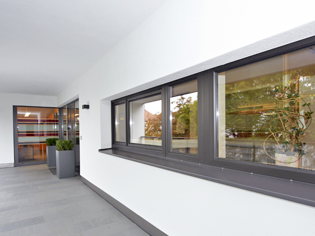 Das intelligente Baukonzept verbindet Wohn- und Gewerbeeinheiten mit flächenschondendem Parkraum. Die Fenster in der >Architecture Color< Graphit Schwarz betonen den urbanen Stil. Die Terrassen wurden farblich passend mit dem