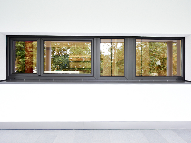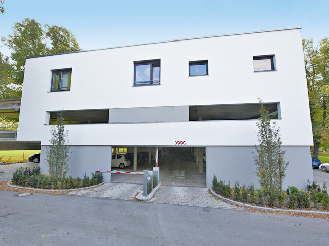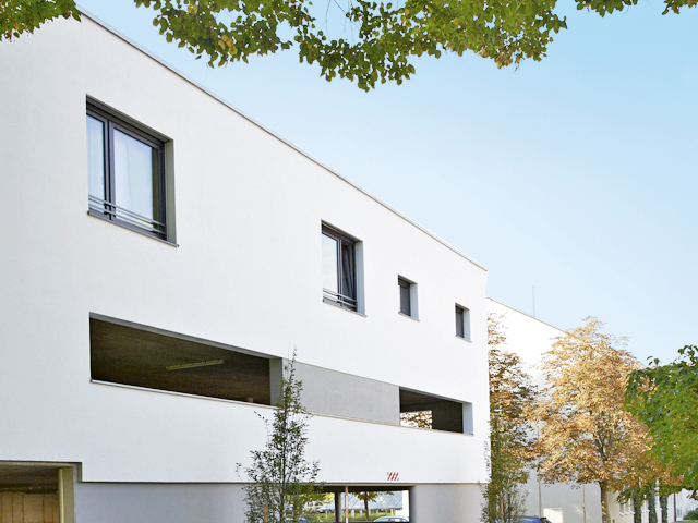 The sustainable design concept shows the intelligent combination of residential apartments and commercial units with a space-economising parking area. The windows in the ›Architecture Color‹ Graphite Black accentuate an urban style. The front terraces are paved in matching colour with the